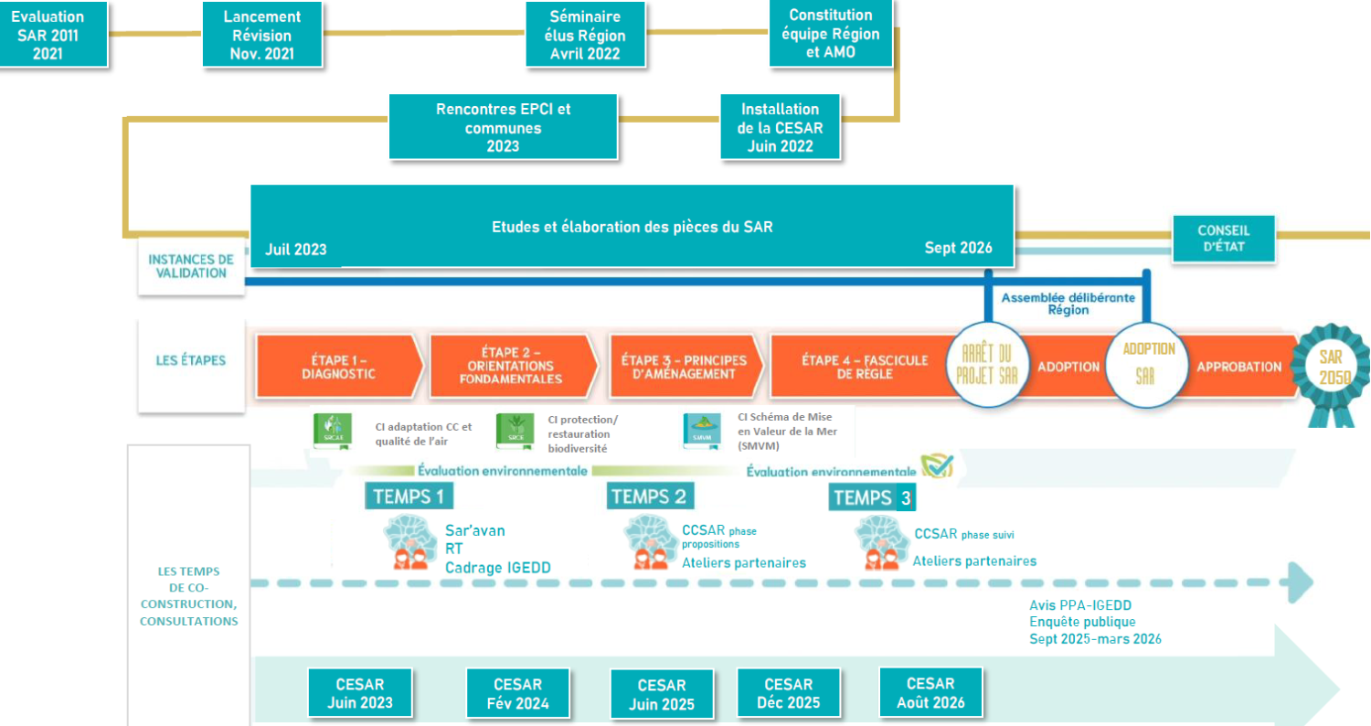 - 2025, place à la rédaction du SAR 2050. Des ateliers thématiques rassemblent les acteurs de la biodiversité, du paysage, de l’agriculture, de la pêche, de la mer, de l’énergie et des risques naturels, afin de consolider les données et construire les stratégies futures. Les membres de la Convention Citoyenne continuent à suivre et enrichir la démarche à travers des plénières d’échanges et les citoyens peuvent continuer de contribuer sur la plateforme