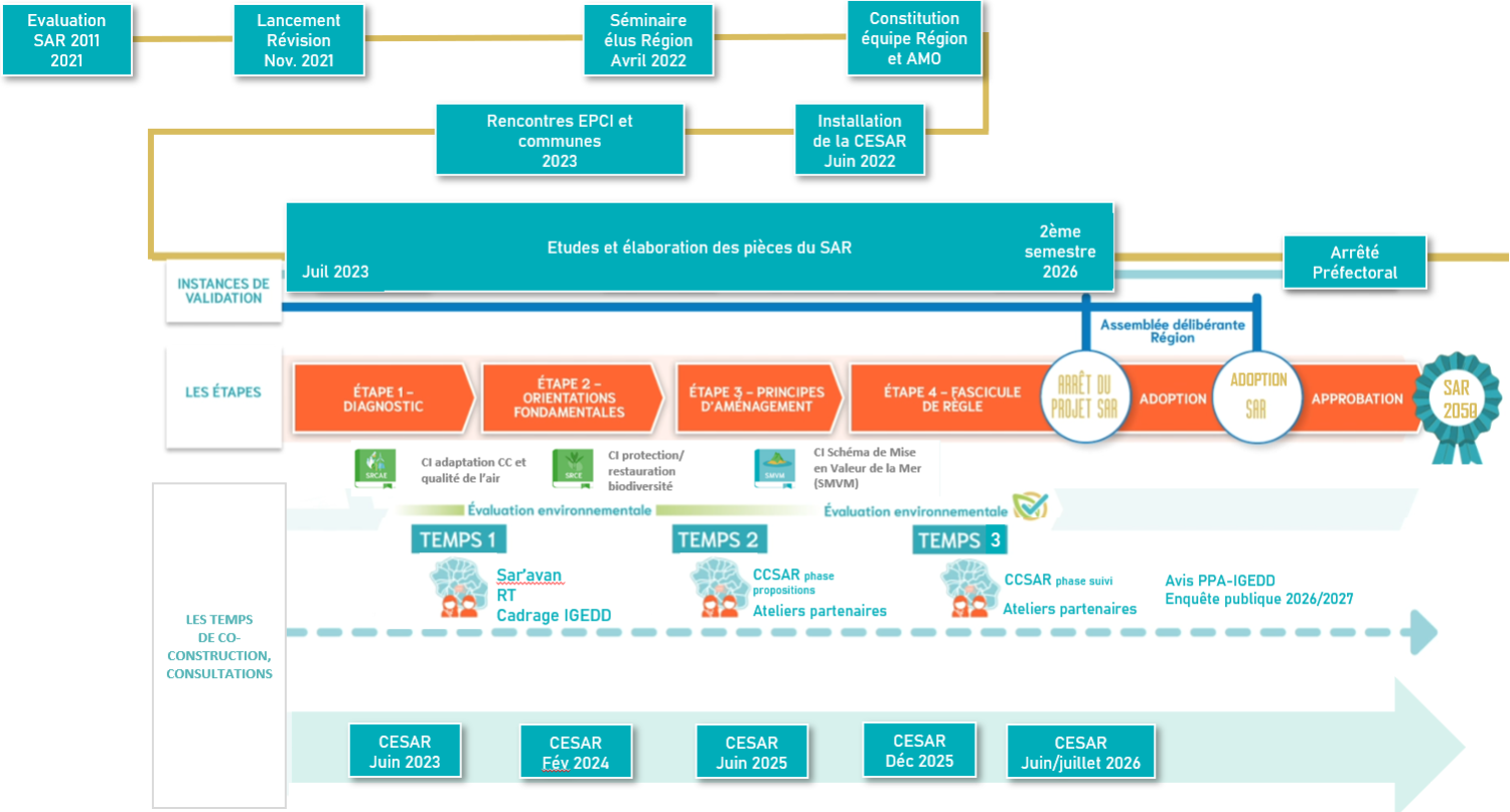 - 2025, place à la rédaction du SAR 2050. Des ateliers thématiques rassemblent les acteurs de la biodiversité, du paysage, de l’agriculture, de la pêche, de la mer, de l’énergie et des risques naturels, afin de consolider les données et construire les stratégies futures. Les membres de la Convention Citoyenne suit les travaux et tous les citoyens peuvent continuer de contribuer sur la plateforme